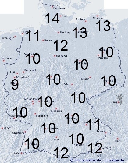 Im Norden fällt gebietsweise Regen oder Sprühregen. Sonst entsteht Benetzung durch Nebelnässe und Tau. Die Benetzungsdauer liegt allgemein zwischen 9 und 14 Stunden, kann aber außerhalb von Ortschaften in geschützten Lagen noch deutlich nach oben abweichen.