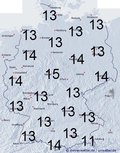 Von Nordwesten zieht ein Niederschlagsgebiet über Deutschland hinweg, dabei fällt in tieferen Lagen meistens Regen, im Bergland überwiegend Schnee. Sonst entsteht Benetzung durch Feuchtigkeit, wie Tau-, bzw. Reifansatz. Die Benetzungsdauer liegt allgemein zwischen 11 und 15 Stunden. Bei einer vorhandenen Schneedecke in den Bergen können aber 24 Stunden erreicht werden.
