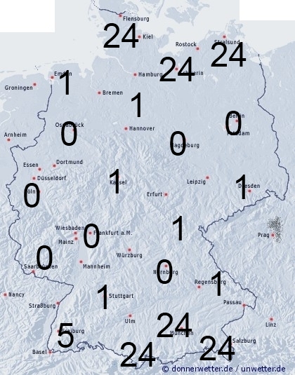 Sowohl im Südwesten, als auch in Schleswig-Holstein kann es etwas schneien. Sonst sorgt der trockene und eisige Nordost- bis Ostwind kaum für Benetzung. Die Benetzungsdauer liegt allgemein zwischen 0 und einer Stunde, bei Schneefall bis zu 5 Stunden. Bei einer vorhandenen Schneedecke werden bis zu 24 Stunden erreicht.