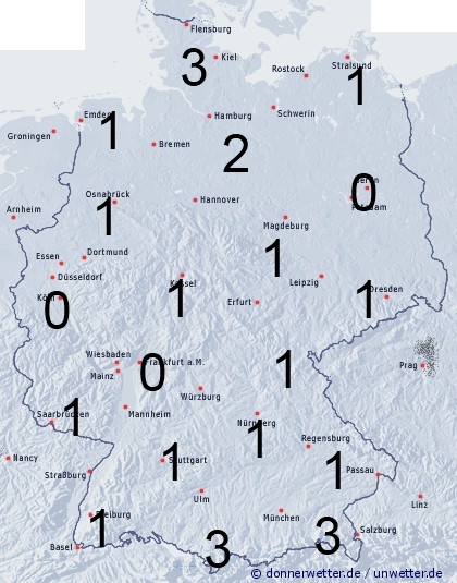 An der Nordseeküste, in Schleswig-Holstein und um Hamburg herum können einzelen Schauer oder Gewitter auftreten und für eine Benetzung von 2 bis 4 Stunden sorgen.