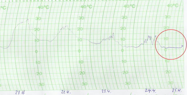Selbst in den milden Niederungen lagen die Lufttemperaturen am Montagmorgen, wie auch unser Temperaturschrieb zeigt, nur um den Gefrierpunkt.