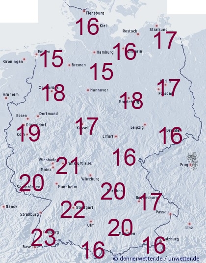 Wegen der kühleren Witterung während der letzten Tage sind auch die Temperaturen im Erdboden gesunken. Die Werte liegen in der Nordhälfte meist zwischen 15 und 20 Grad, im Süden meist zwischen 17 und 24 Grad. Kühler bleibt es nur in den Mittelgebirgen und an den Alpen.