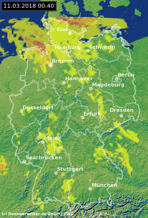 Das Radarbild zeigt aktuell vor allem im Norden noch leichte bis mäßige Signale mit Regen, die Richtung Dänemark abziehen. Sonst ist der Himmel über Deutschland überwiegend wolkenverhangen und nur gebietsweise aufgeklart. Stellenweise haben sich in der feucht-milden Luftmasse Nebelfelder ausgebreitet.