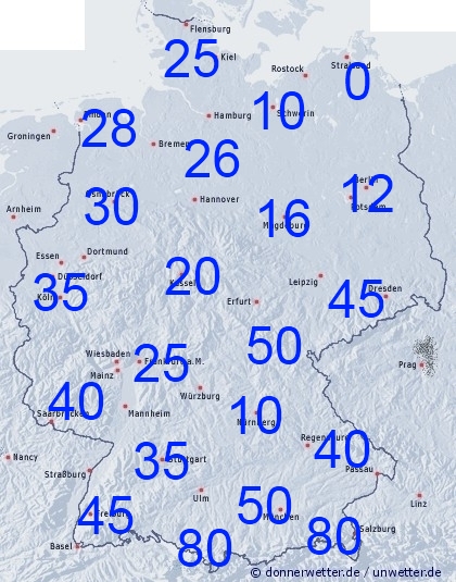 Die gemittelten Niederschlagssummen bis Samstag 00 UTC zeigen große Abweichungen. Während es ganz im Nordosten, sowie auf Rügen in der Regel trocken bleibt, können in den übrigen Bereichen Schauer und Gewitter für sehr unterschiedliche Niederschlagsmengen auf engstem Raum führen. Die zu erwartenden Regengüsse sind in den Mittelgebirgen und an den Alpen oft am höchsten. Bei örtlichen Unwettern mit Starkregen und Hagel sind allerdings schon in recht kurzer Zeit Mengen von bis zu 100 Liter pro Quadratmeter oder mehr möglich. Dann drohen Überschwemmungen und Schlammlawinen.