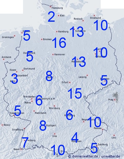 Die bis Freitag 00 UTC zu erwartenden Niederschlagsmengen treten meist nur örtlich in Form von Schauern und Gewittern auf und können schon auf engstem Raum deutlich voneinander abweichen. Im Mittel fallen in Deutschland zwischen 2 und 15 Liter Niederschlag pro Quadratmeter, örtlich aber auch deutlich mehr.