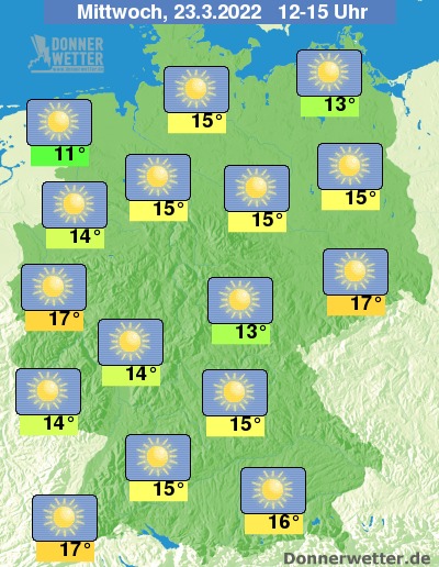 Heute Nachmittag ist es verbreitet sonnig, dabei bleibt es trocken. Die Temperatur liegt bei teils nur 11 Grad an der Nordseeküste und etwa 17 Grad im Oberrheingraben.