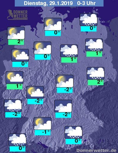 Die Temperaturen erreichen Werte um 2 Grad C in Ostfriesland und um -3 Grad C im Pfälzer Wald.