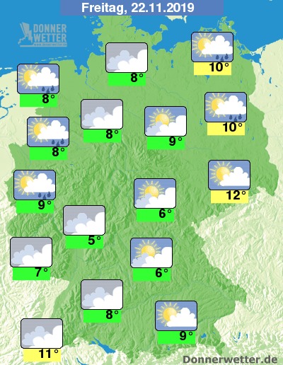 An Niederrhein und Ems, sowie im Ostseeumfeld halten sich zunächst noch einige kompaktere Regenwolken, die sich jedoch bis zum Vormittag, bzw. Mittag verziehen. Im übrigen Land gibt es eine Mischung aus Wolken, Nebel und gebietsweise auch größeren Aufheiterungen.