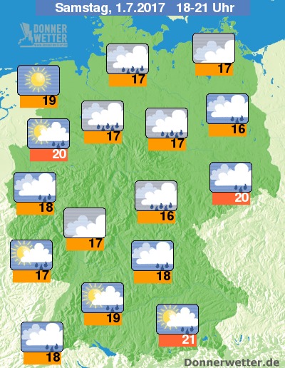 Heute Abend klingen die Niederschläge im Nordwesten ab und der Himmel reißt auf. Im Süden ist es zum Teil aufgelockert, teils stark bewölkt bei einzelnen Schauern. Im großen Rest der Republik halten sich dichte Wolken, dazu fällt zeitweise Regen. Die Temperatur liegt bei 16 Grad im Thüringer Becken und bis 21 Grad im Raum München.