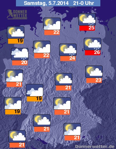 Am Abend entwickeln sich besonders im Norden und Nordosten vielfach Schauer und Gewitter, sonst sind bei wechselnder bis starker Bewölkung weiterhin örtliche Schauer und Gewitter möglich. Die Abendtemperatur liegt bei schwülwarmen 26 Grad in Berlin und etwas kühleren 19 Grad im Hunsrück.