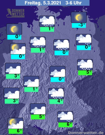 In der kommenden Nacht bleibt der Himmel überwiegend wolkenverhangen und mit Ausnahme der westlichen Landesteilen und der küstennahen Regionen fällt gebietsweise Regen, der im Nachtverlauf immer häufiger in Schneeregen und Schnee übergeht. Die Temperatur sinkt auf 6 Grad in Freiburg und bis -3 Grad an der Müritz.