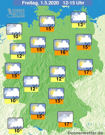 Am frühen Nachmittag wechseln sich kurze sonnige Abschnitte mit Regen- und Schauerwolken ab, örtlich blitzt und donnert es dabei auch.