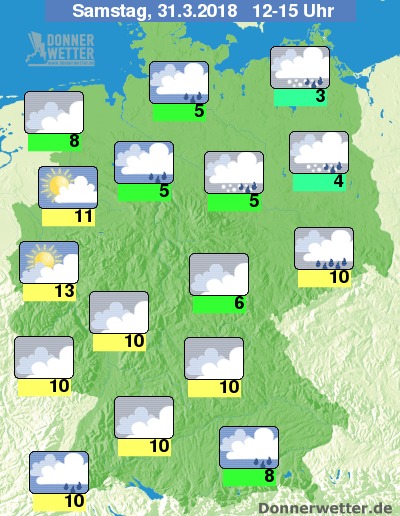 Heute Nachmittag ist es im gesamten Land weitgehend stark bewölkt, dabei bleibt es über dem Westen und Süden bis auf einzelne Schauer größtenteils trocken, über der Nordosthälfte fällt hingegen immer wieder Regen und im Norden auch zum Teil Schneeregen oder Schnee. Die Temperatur liegt bei 5 bis 13 Grad.