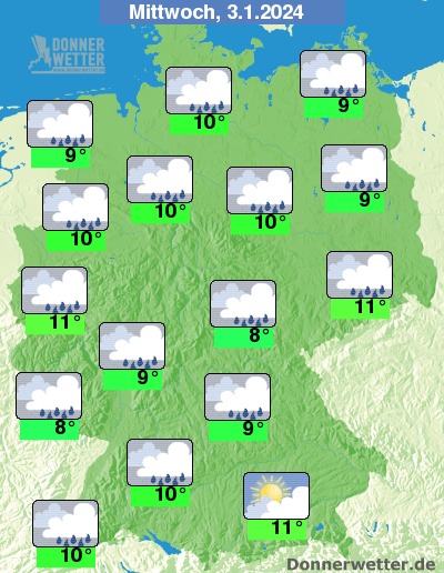 Am Mittwoch zeigt sich der Himmel über weiten Landesteilen stark bewölkt oder es ist bedeckt, dabei muss verbreitet mit schauerartigem Regen gerechnet werden. Bei größeren Auflockerungen häufiger trocken bleibt die Wochenmitte in der Südosthälfte. Ausgenommen den Nordosten weht am Mittwoch ein meist starker Wind mit teils stürmischen Böen; auf den Gipfeln und an der Nordsee Sturm oder schwerer Sturm.
