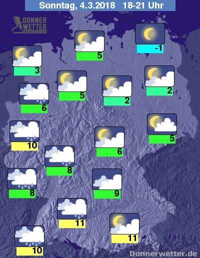 Heute Abend bringen kompakte Wolken dem Westen und Südwesten zeitweiligen Regen, angrenzend weiter nach Osten hin ist es meist stark, vor allem in den östlichen Landesteilen meist locker bis wechselnd bewölkt, dazu bleibt es trocken. Die Temperatur liegt bei -1 bis 11 Grad.
