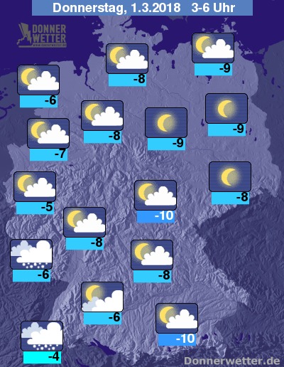 In der folgenden Nacht bleibt es über dem Norden und Osten meist sternenklar, sonst nimmt die Bewölkung von Südwesten her stetig zu und im Nachtverlauf sind über dem Saarland und entlang des Oberrheins Schneefälle möglich, sonst bleibt es jedoch trocken. Die Temperatur sinkt auf -4 Grad in Freiburg und bis -10 Grad im Thüringer Becken.