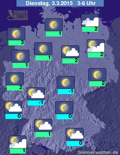 In der Nacht zum Dienstag ist es häufig sternenklar, vor allem im Nordosten und im Südwesten ziehen aber auch teils dichte Wolken durch, es bleibt größtenteils trocken. Die Tiefstwerte liegen bei 3 Grad an der Nordseeküste und bis -1 Grad im Grabfeld. Vor allem in der Nordhälfte des Landes weht weiterhin ein frischer bis starker, in Böen, sowie an der See und auch den Bergen stürmischer Wind. An den Küsten und auf den Bergen sind Sturmböen möglich.