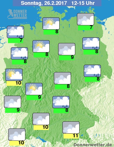 Heute Nachmittag zeigt sich das Wetterbild für die Jecken doch eher bewölkt, wobei die Sonne hier und da doch zum Zuge dabei sein kann. Gebietsweise Regen fällt allerdings besonders im Norden, aber auch im Osten des Landes. Im übrigem Bundesgebiet bleibt es mehrheitlich trocken. Die Temperatur steigt auf 7 Grad an der See und bis 11 Grad in München.