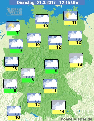Heute Nachmittag lockert der Himmel im Nordseeumfeld und im weiteren Verlauf auch im übrigen Nordwesten immer weiter auf und es bleibt trocken. Auch an der Ostsee zeigt sich die Sonne häufiger. Im übrigen Bundesgebiet halten sich hingegen meist dichte Wolken und es fällt zeitweise Regen. Die Temperatur liegt bei 7 Grad an der Nordsee und bis 14 Grad in Görlitz.