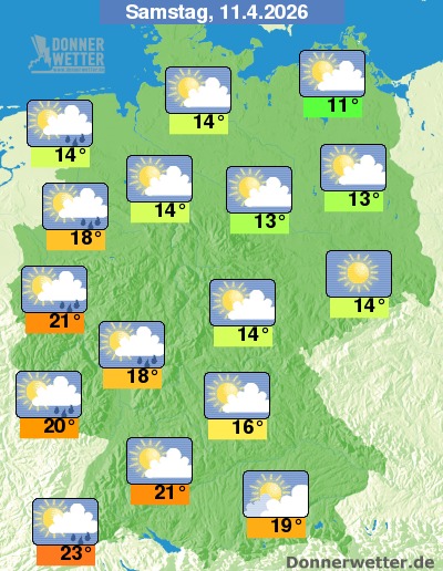 Am Samstag bleibt das Wetter zunächst verbreitet heiter oder sogar sonnig und dabei auch trocken. Bereits gegen Mittag ziehen jedoch von Westen her immer mehr und dichtere Wolken auf und im weiteren Verlauf setzt in den westlichen Landesteilen auch Regen ein oder es bilden sich Schauer. Weiter nach Osten hin nimmt die Bewölkung insgesamt auch etwas zu, jedoch bleibt es hier noch trocken. Die Höchstwerte liegen bei 11 Grad an der Müritz und bis zu 23 Grad im Breisgau. An der Nordsee weht ein starker und zunehmend auch stürmischer Wind.