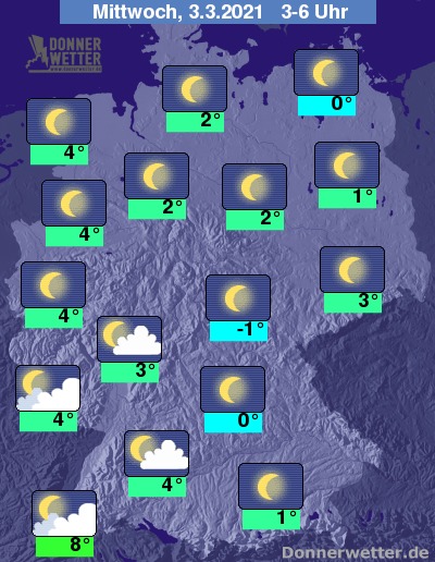 In der folgenden Nacht bleibt es zunächst bei einem sternenklarem Himmel. Im Laufe der zweiten Nachthälfte können im Westen und Südwesten einige, meist lockere Wolken durchziehen, dazu bleibt es aber trocken. Die Temperatur sinkt auf 8 Grad am Oberrhein und bis -1 Grad im Vogtland.