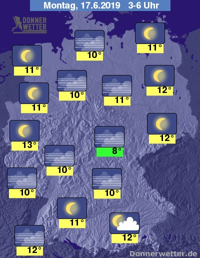 In der Nacht zum Montag klart der Himmel auch über dem Osten und Süden, wie bereits schon im übrigen Bundesgebiet, verbreitet auf und es bleibt landesweit trocken. Die Temperatur sinkt auf 13 Grad in Bonn und bis 8 Grad in Erfurt.