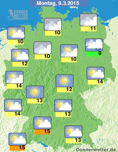 Heute bleibt es vor allem von der breiten Mitte bis in den Süden des Landes verbreitet heiter oder sonnig und dabei trocken. Nach Norden ziehen dagegen gebietsweise auch dichte Wolken, die aber nur hier und da etwas Regen bringen können, sonst bleibt es trocken. Die Höchstwerte erreichen 9 Grad im westlichen Brandenburg und um 15 Grad im Oberrheingraben.