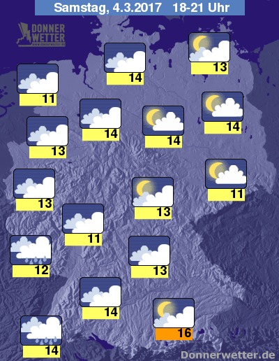 In der Nacht zum Sonntag zeigt sich der Himmel im Norden und Osten noch zeitweise aufgelockert, sonst und im übrigen Land hingegen weitgehend stark bewölkt, dazu fällt besonders am Niederrhein, aber auch im Südosten und vereinzelt über der Südwesthälfte Deutschlands Regen. Im Norden und Osten bleibt es trocken. Die Temperatur sinkt auf 8 bis 4 Grad.