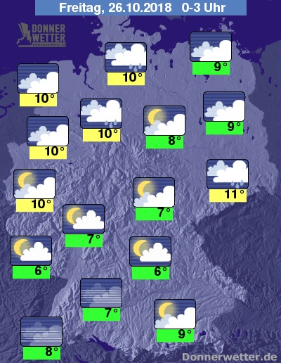 In der Nacht bleibt der Himmel in der Nord- und Osthälfte meist stark bewölkt, vor allem zwischen Ems und Elbe sowie in Teilen Sachsens können zudem einzelne Schauer fallen. Im Süden herrscht lockere Bewölkung vor oder es klart auf, regional kann sich Nebel bilden.