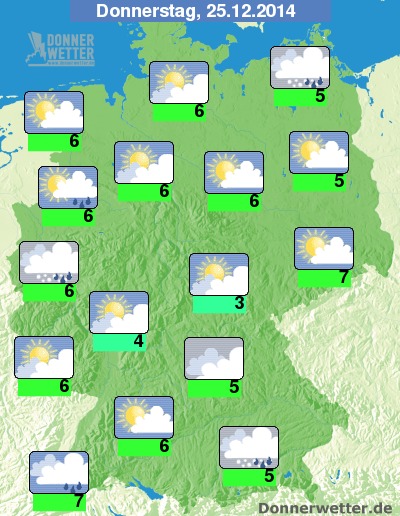 Am heutigen 1. Weihnachtsfeirtag erwartet uns ein ziemlich durchwachsener Tag mit meist vielen, oft dichten Wolken, aber auch mit einzelnen Auflockerungen. Dazu fällt hier und da etwas Regen, Schneeregen und regional auch Schnee bis ins Flachland. Im Norden weht teils starker, an der Nordsee teils stürmischer Wind. Die Temperatur steigt auf 3 Grad im Coburger Land und bis 7 Grad in Freiburg.