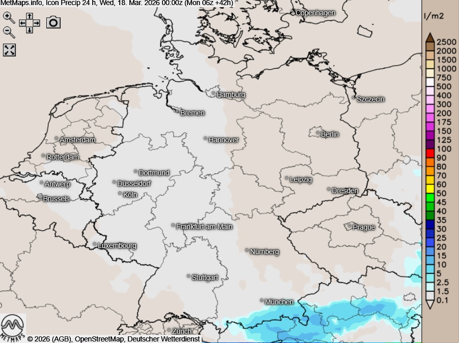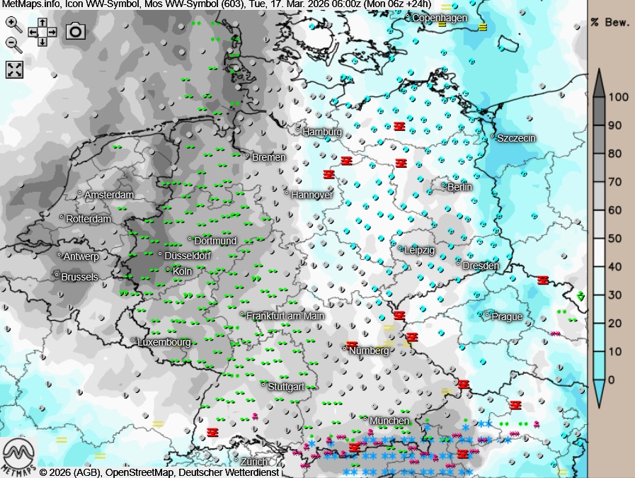 Die Wetter- und Temperaturkarte für 06:00 Uhr sowie die 24-Stunden-Regenmengen für Dienstag nach ICON: