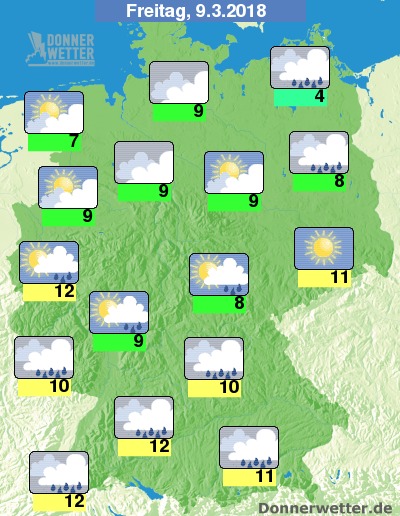 Ganz im Nordosten, sowie im Süden fällt örtlich etwas Regen. Dazwischen gibt es längere Aufheiterungen mit Sonnenschein. Ab Mittag trübt sich der Himmel von Südwesten her ein und leichter Regen dehnt sich allmählich bis in die Landesmitte aus. Ab dem Abend fällt auch im Nordwesten leichter Regen. Die Tageshöchsttemperaturen liegen in der Nordosthälfte zwischen 4 bis 10 Grad, in der Südwesthälfte schon bei milden 8 bis 14 Grad. Der Wind bläst im Nordosten noch böig, sonst weht er meist nur schwach bis mäßig.