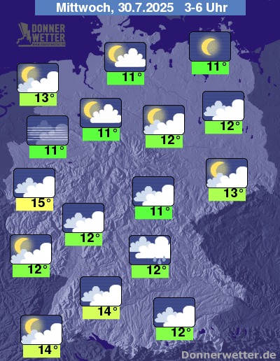 In der Nacht zum Mittwoch klingen die Schauer meist ab und es lockert in weiten Teilen der Bundesrepublik auf. Dichte Wolken halten sich allerdings vor allem im Norden von Bayern und Baden-Württemberg, hier können sich Schauer bilden. Die Tiefstwerte liegen bei 15 Grad in Köln und bis 11 Grad in Schwerin.