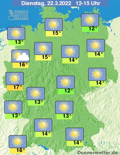 Heute Nachmittag ist es verbreitet sonnig, am Rhein sind selten ein paar Wolken möglich, dabei bleibt es trocken. Die Temperatur liegt bei 12 Grad in Jena und bis 17 Grad in Bonn.