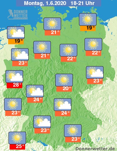 Heute Abend sind am Niederrhein und an der Ems gebietsweise einige Wolken möglich, sonst ist es weiterhin meist sonnig und es ziehen nur selten Wolken durch. Es bleibt überall trocken bei Werten zwischen 19 Grad in Cuxhaven und bis zu 28 Grad in Köln.