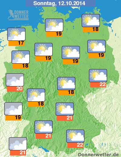 Am Sonntag kann sich zwischen den Wolken auch häufiger die Sonne zeigen, gebietsweise und vor allem im Westen und Südwesten bleibt die Wolkendecke jedoch auch geschlossen. Im äußeren Westen ist gegen Abend auch etwas Regen möglich, sonst bleibt es aber weitgehend trocken. Die Temperatur steigt auf milde Herbstwerte zwischen 17 Grad an der Ems und bis 22 Grad in München.