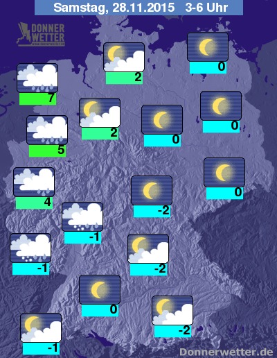 In der bevorstehenden Nacht bleibt der Himmel über der Südosthälfte weitgehend sternenklar und es bleibt auch trocken, sonst ziehen von Nordwesten her jedoch dichte Wolken herein und es fällt immer wieder Regen, vor allem in höheren Lagen auch Schneeregen oder Schnee mit entsprechender Glättegefahr! Die Temperatur sinkt auf 7 Grad in Emden und bis Werte um -2 Grad in München. An den Küsten ist weht der Wind oft stark bis stürmsich.