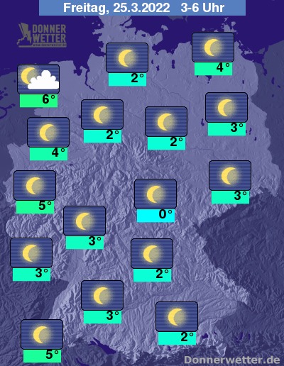 In der bevorstehenden Nacht ist der Himmel praktisch bundesweit sternenklar, lediglich an der Nordsee können hier und da ein paar Wolken durchziehen. Es bleibt landesweit trocken bei Tiefstwerten von 6 Grad in Wilhelmshaven und um 0 Grad in Jena.
