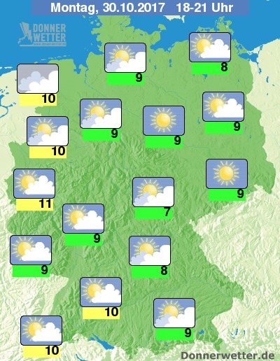 Heute Abend ist es besonders über dem Südwesten und dem Osten größtenteils sonnig und sonst nur locker bewölkt. Mehr und zum Teil auch dichte Wolken ziehen über den Südosten Deutschlands, sowie über Niedersachsen und Schleswig-Holstein hinweg, dazu bleibt es weitgehend trocken. Die Temperatur liegt bei 7 bis 11 Grad.