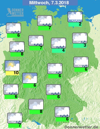 Am Mittwoch hält sich verbreitet starke Bewölkung, dabei fällt zeitweise Regen, im Süden, Osten und Nordosten fällt zum Teil auch Schneeregen oder Schnee. Die besten Chancen für Auflockerungen bestehen im Westen Deutschlands. Die Temperatur steigt auf 2 bis 10 Grad.