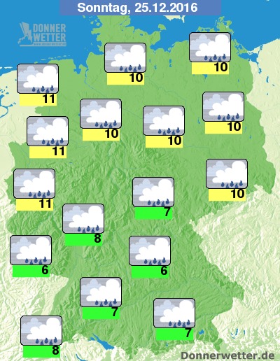 Der heutige 1. Weihnachtsfeiertag fällt buchstäblich ins Wasser, denn bei dichter und dunkler Bewölkung fällt immer wieder, zum Teil auch langanhaltender und kräftiger Regen. Die Temperaturen sind zumindest ziemlich mild und liegen bei 6 Grad in Oberfranken und um 11 Grad am Niederrhein. Im Norden weht ein teils starker, an den deutschen Küsten ein teils stürmischer Wind.