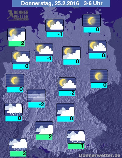 In der Nacht zum Donnerstag fällt im Alpenvorland unter dichten Wolken zeitweise Schnee oder Schneeregen, dazu besteht Glättegefahr! Im übrigen Süden ist es meist stark bewölkt jedoch trocken, sonst zeigt sich der Himmel hingegen meist locker bewölkt und zum Teil auch sternenklar, an der Nordsee sind einzelne Schneeschauer möglich, sonst bleibt es trocken. Die Temperatur sinkt auf 3 Grad in Freiburg und etwa -2 Grad im Eichsfeld.