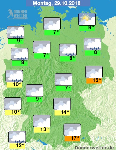 Am Montag halten sich verbreitet dichte Wolken, dabei bleibt es zumeist trocken, gebietsweise ist allerdings leichter Regen oder Sprühregen möglich. Die Temperatur steigt auf 7 Grad in der Norddeutschen Tiefebene und bis 17 Grad in Berchtesgaden.
