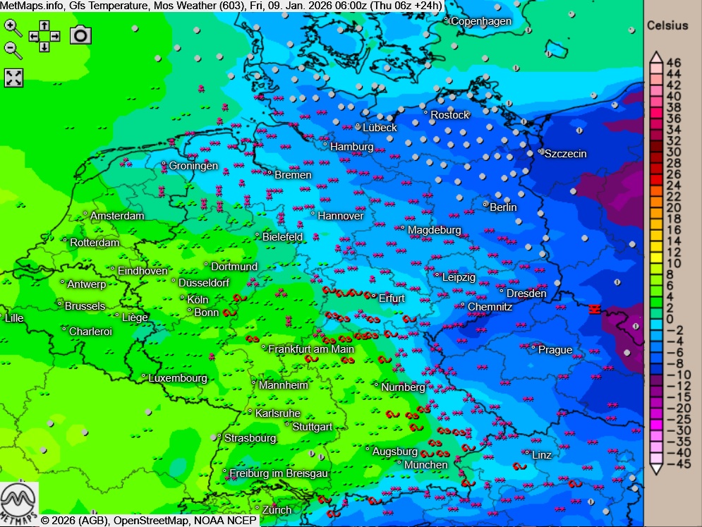 Die Temperaturen erreichen am Freitag Höchstwerte um -6 Grad am Stettiner Haff und bis 8 Grad in Baden.
