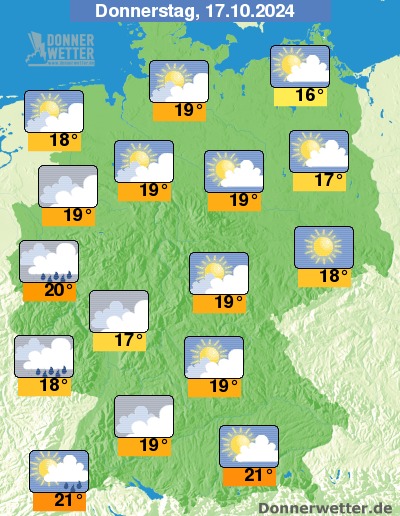 Am Donnerstag scheint über der Osthälfte des Landes und im Süden häufig die Sonne, dabei bleibt es trocken. Weiter nach Westen hin ziehen viele, oft dichte Wolken durch, vor allem westlich des Rheins ist dabei auch Regen möglich. Die Temperatur steigt auf 16 Grad an der Ostsee und bis 21 Grad am Oberrhein.