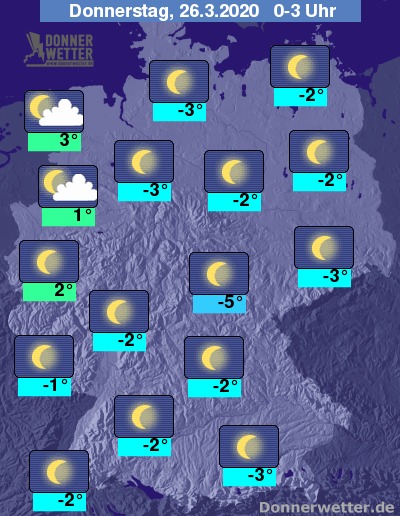 Die Temperaturen sinken im Flachland auf Werte um 1 Grad C in Emden und um -5 Grad am Alpenrand. In den höheren Lagen der Mittelgebirge teils Werte um -9 Grad.