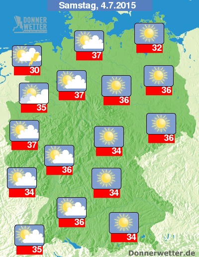 Am Samstag ist es vor allem in der Osthälfte des Landes verbreitet sonnig, sonst ist es überwiegend heiter bis sonnig und zunächst überall trocken. Am Nachmittag und Abend können sich jedoch im Norden und Westen gebietsweise schwere Gewitter entwickeln. Am Alpenrand besteht ein leichtes Schauer- und Gewitterrisiko, sonst bleibt es weitgehend trocken. Die Temperatur steigt auf rund 30 Grad an der Nordseeküste und bis auf drückend heiße 37 Grad im Rheinland und in Norddeutschland.