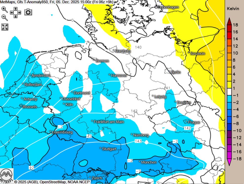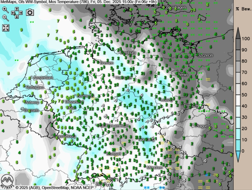 Höchsttemperaturen am Freitagnachmittag um 0 bis 8 Grad.