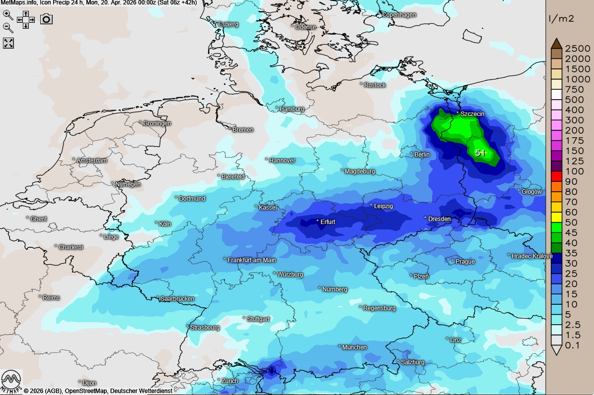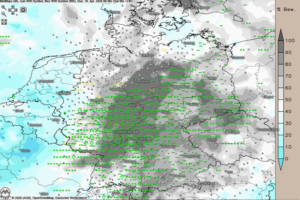 Die Wetterkarte für 06:00 Uhr, die Lufttemperaturen für 15:00 Uhr und die 24-Stunden-Regenmengen für Sonntag nach ICON: