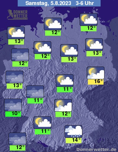 In der folgenden Nacht hält sich vor allem im Süden und Osten noch oft starke Bewölkung, an den Alpen bilden sich auch zeitweise Regen, sonst bleibt es trocken. Im übrigen Land ist es verbreitet nur locker bewölkt und teils sternenklar, dazu bleibt es ebenfalls trocken. Die Temperatur sinkt auf 16 Grad in Dresden und bis 10 Grad in Saarbrücken.